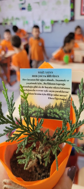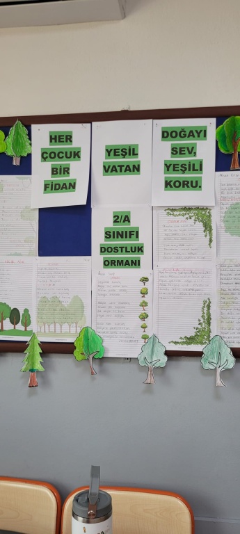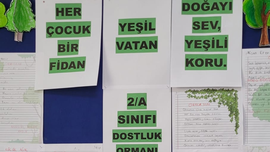 Son zamanlarda ülkemizde sıklıkla yaşadığımız orman yangınları hepimizi derinden üzdü. Bu nedenle 2025-2026 Eğitim ve Öğretim yılının ilk dersini YEŞİL VATAN konusuna ayırdık. Hafta boyunca çeşitli etkinlikler yaptık. Öğrencilerimizde çevre farkındalığını artırmak için ormanların korunması ve ormanın faydaları üzerinde durduk. HER ÖĞRENCİ BIR FİDAN sloganıyla 2-A sınıfı öğrencileri DOSTLUK ORMANI oluşturdu. Her öğrenciye bir fidan verildi. Fidanın dikimi ve bakımı sorumluluğu verilerek doğayla doğrudan temas kurmaları hedeflendi. Okul bahçesine fidanlar dikilerek,çevreye duyarlı alışkanlıkların hem okulda hem de aile ortamında günlük yaşamın parçası haline gelmesi sağlandı... Daha YEŞİL BIR VATAN için haydi hep beraber el ele verelim...