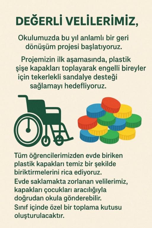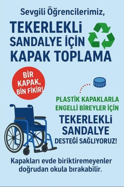 Okulumuzda 4-C Sınıfı Öncülüğünde Başlatılan Mavi Kapak Toplama Kampanyası Öğrencilerimiz ve Velilerimizin Gösterdiği İlgi Sayesinde Devam Ediyor. İkinci Bir Adım Olarak Mahallemizede Duyurulması Planlanan Kampayamızda Çok Kısa Zamanda En Yüksek Kapak Toplama Oranına Ulaşmayı Hedefliyoruz. 4-C Sınıfımızın Öğretmen Veli ve Öğrencileri ile Kampanyaya Destek Veren Tüm Öğretmen, Veli, Öğrenci ve Komşularımıza Teşekkür Ediyoruz...